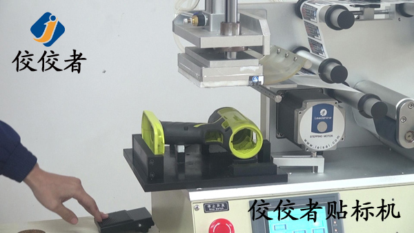 手電鉆貼標機應用比較廣泛,像內存卡、小黑片、鑰匙扣,甚至小包裝盒也是可以貼的,不過一般小包裝盒子的話,產量基本比較大,我公司作為負責任的貼標機廠家,一般會建議客戶選擇全自動貼標機。下面來介紹手電鉆貼標機的詳細流程,這個流程相對于全自動貼標機來說還是比較簡單的,首頁把手電鉆放到貼標機的治具(固定產品用的模具,可根據產品的不同進行定制)上面,如下圖: