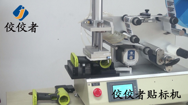 手電鉆貼標機就是指可以對手電鉆進行貼標的機械設備,高臻智能公司內部人員通常稱之為半自動平面貼標機。今天介紹的這臺手電鉆貼標機是帶有觸摸屏的,如下圖