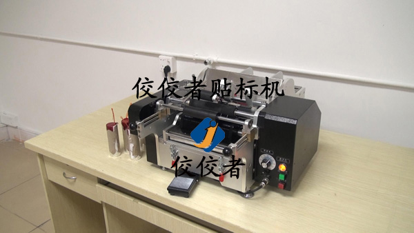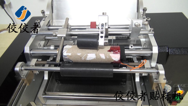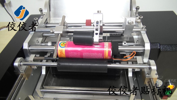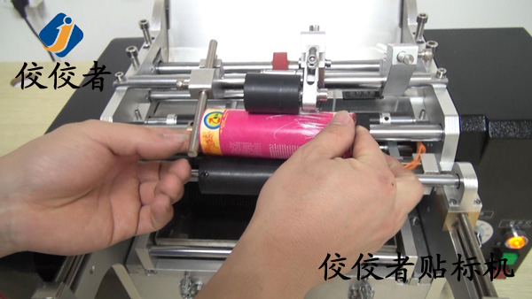將產(chǎn)品放入到貼標機上放產(chǎn)品的位置,這里可根據(jù)產(chǎn)品直徑大小和長短來調(diào)整這個間隔,讓產(chǎn)品放上去平穩(wěn),然后踩腳踏開關(guān),標簽出標貼標覆標,如下圖: