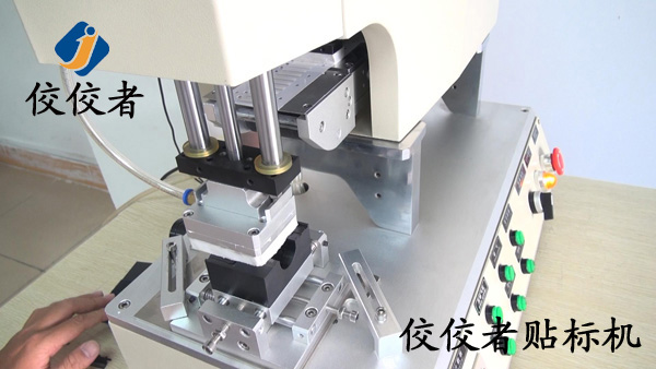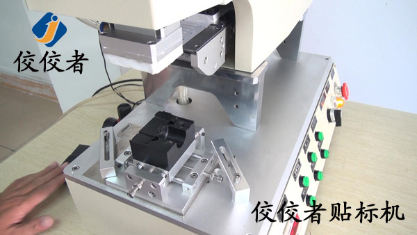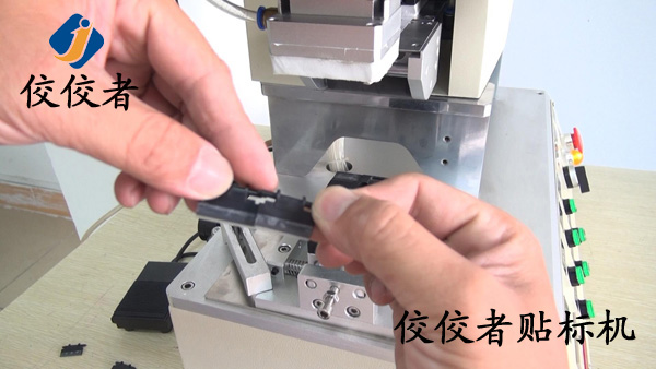 這臺高精度半自動平面貼標機是上海的一個客戶為小黑片定制的平面貼標機,貼標的時候把產品放到上圖的黑色小方塊上面的小槽中,機器上面部分便向下運動為小黑片貼標,如下圖: