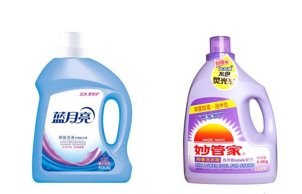 左邊的洗衣液瓶就是只貼單面的。右邊的那個洗衣液瓶要貼三張不干膠標(biāo)簽。雙側(cè)面要貼,而且還要在頸部部一張。這個有點難度,但是可以貼,用非標(biāo)準(zhǔn)機就可以加工了。